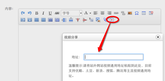 知校已经支持站外视频分享啦(目前已支持优酷、土豆、新浪、搜狐、腾讯等主流视频网站),请跟着我们一步步学习视频分享吧: 1. 以优酷视频为例,第一步先进入优酷官网(http://www.youku.com) ,找到对应的视频并播放; 2. 观察播放窗口下面有一项【分享给好友】,点击右边下拉箭头展开: 3. 此时点击如图所示的【通用代码】行右侧“复制”,将信息复制到剪贴板; 4. 返回知校平台,在发布信息时,点开【视频分享】按钮,将地址粘贴并确认。 通过以上步骤即可分享站外视频啦,是不是很简单呢?O(∩_∩)O~ |