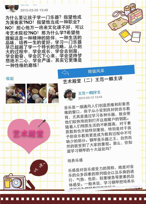 5、艺术殿堂。班级学钢琴的、二胡、小提琴等乐器的不少人,家长都有培养意识。班级中王范一麟家长已给孩子设计了必走专业路线,每日所以此栏目由他妈妈先试行推送。